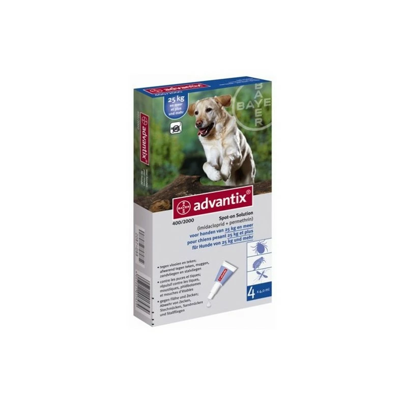 | van 25 tot 40 kg | Advantix 400/2000 spot-on solution voor honden | 4,0 ml | 10 – 16 | 50 – 80 |