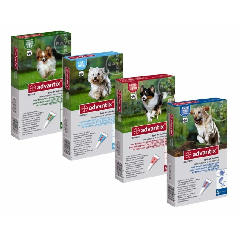 | van 4 tot 10 kg | Advantix 100/500 spot-on solution voor honden | 1,0 ml | 10 – 25 | 50 – 125 |