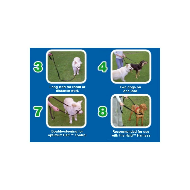 De Halti trainingsriem is door Dr Roger Mugford ontworpen om honden te leiden en controleren. Deze lijn is zowel bruikbaar voor het dagelijkse leven als voor het trainen van de hond. U kunt de lijn extra kort maken voor als uw hond dicht bij u moet blijven lopen, en juist verlengen als u hem meer ruimte wilt geven.