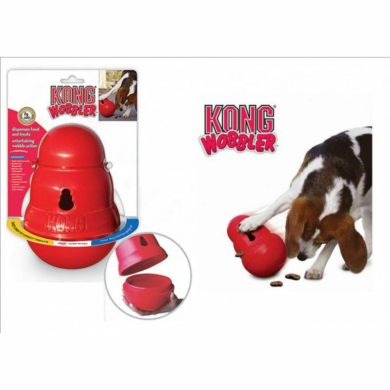 De KONG Wobbler heeft dezelfde vorm als de KONG Classic maar werkt op een andere manier. De hond dient met zijn poten tegen de KONG Wobbler te duwen om de brokken of koekjes eruit te krijgen. De KONG Wobbler maakt hierbij onvoorziene bewegingen waardoor het voor de hond een speelse uitdaging blijft om de brokjes of koekjes eruit te krijgen.