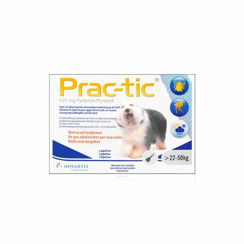- Honden tussen 23 en 50 kg : Prac-tic L voor grote honden (625 mg Pyriprole)