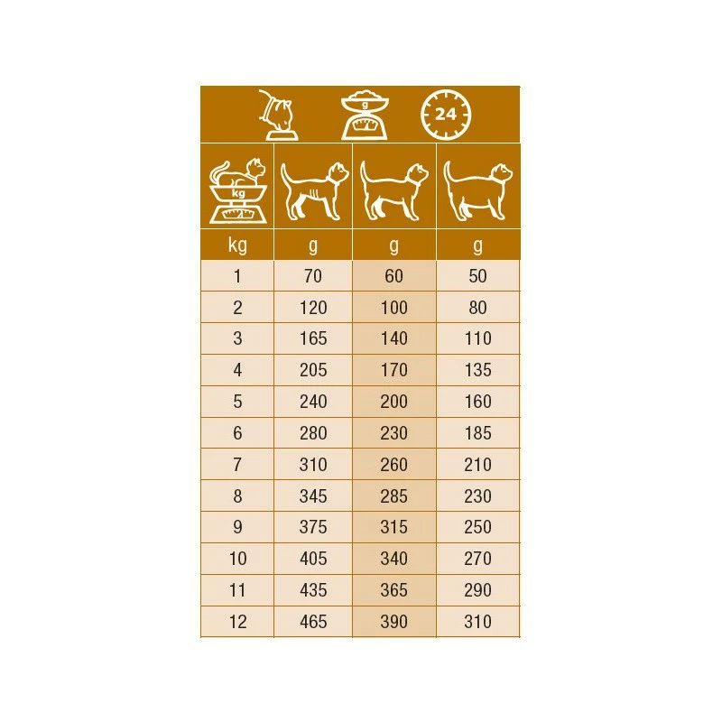 De centrale kolom (intensere kleur) overeenkomt met de hoeveelheid Specific Cat Struvite Dissolution FSW in het geval van een kat met een normale toestandsgewicht. Voor een kat met overgewicht vindt u de voedingshoeveelheid in de rechterkolom, en voor een magere kat in de linkerkolom.